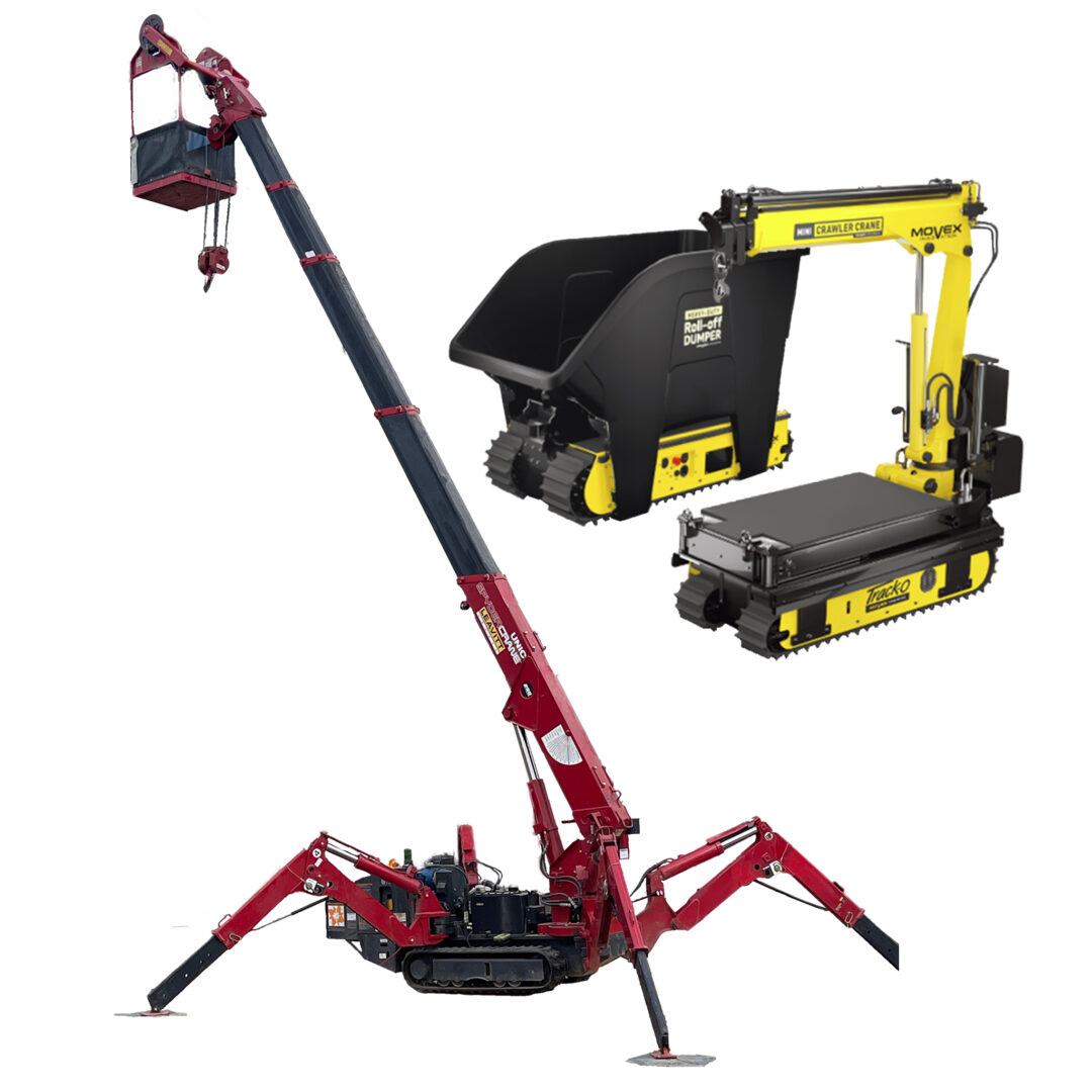 Spydercranes, Mini Crawler Cranes, Stair Climber Crane, Movex Cranes, Pickers, Dump Trucks with Palfinger and HIAB Pickers, 30’ Tri-Axle Trailer, HOT SHOT Service